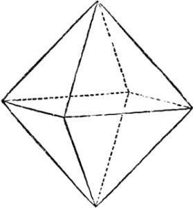 Oktahedron (8 egyenlő oldalú háromszög, középen egy négyzet keletkezik a test belsejében)