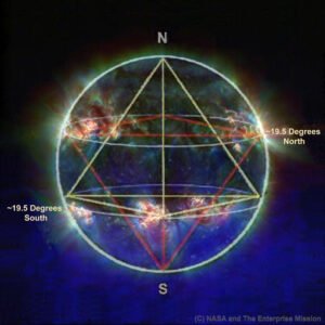 Menjünk tovább egy "forró irányba. Itt egy cikk, a 2017-es kínai Holdistennő holdszonda küldetésről szól, és arról, hogy ezt a kínaiak komoly kiszivárogtatásnak szánták. A Richard Hoegland már rég felfedezte, hogy a tetrahedronnak köze van a bolygókhoz. Ha egy bolygó pólusából kiindulva egy tetrahedront helyezel a bolygóba, akkor annak az alja az egyenlítő alatt a 19,51 fokon lesz. És mit lehet látni? Hogy minden bolygón, sőt a napon is az alsó és felső (déli, és északi) 19,51 szélességi fokán körben érdekes energetikai jelenségeket fogsz találni. Állandó viharok és viharsávok az óriásbolygókon az északi és déli 19,51 szélességi körén, a Jupiter és a Neptun szeme ezen a szélességi körön helyezkedik el, de még a napfoltok is e szélességi körök mentén történnek!