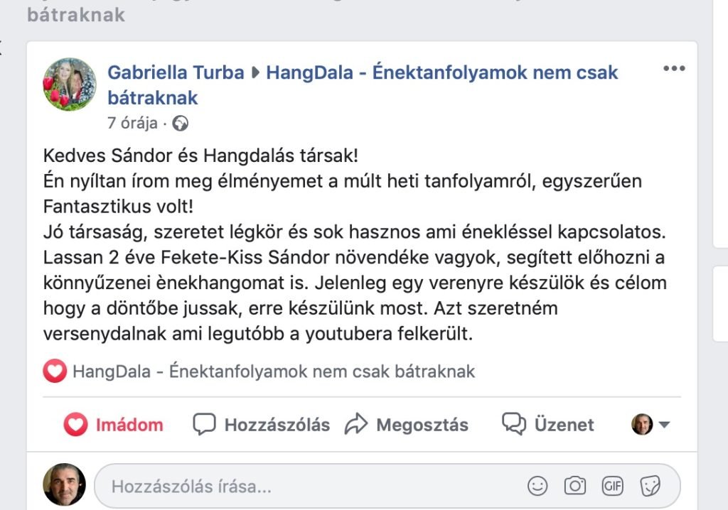 Lassan 2 éve Fekete-Kiss Sándor növendéke vagyok, segített előhozni a könnyűzenei ènekhangomat is. Jelenleg egy verenyre készülök és célom hogy a döntőbe jussak, erre készülünk most.